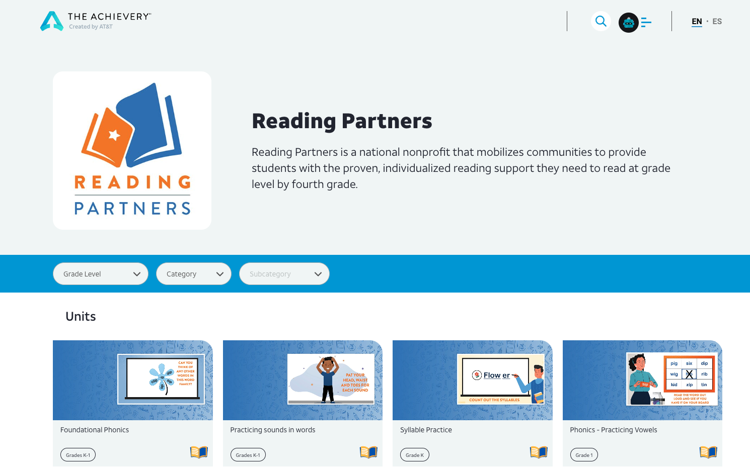 "We are proud to collaborate with AT&T on The Achievery to deliver literacy resources that help promote learning everywhere – at home, in the community, or in the classroom," said Reading Partners CEO Adeola Whitney. “We believe reading is a civil right and are thrilled to be translating our proven literacy instruction into video lessons through this free digital portal.”