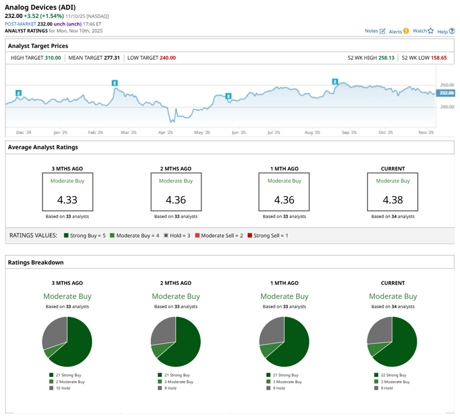 Among the 34 analysts covering ADI stock, the consensus is a “Moderate Buy.” That’s based on 22 “Strong Buy” ratings, three “Moderate Buys,” and nine “Holds.”