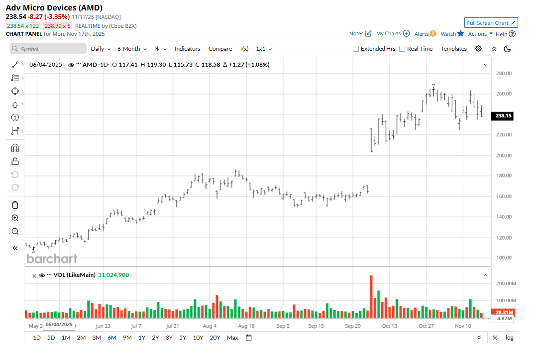 AMD stock has given returns of nearly 80% in the last one year, comfortably outperforming the S&P 500 Index ($SPX). Consistent AI-induced deals helped the stock go up steadily since April, but it was the OpenAI deal that really accelerated the stock price in October.