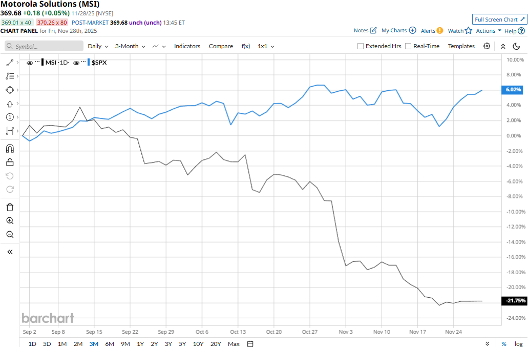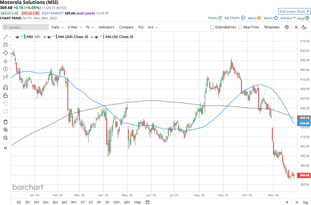 MSI stock dropped below its 50-day moving average in late September and below its 200-day moving average in mid-October, underscoring its bearish trend.