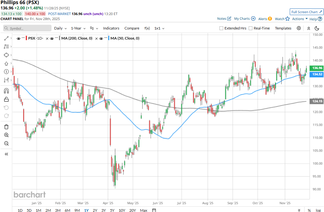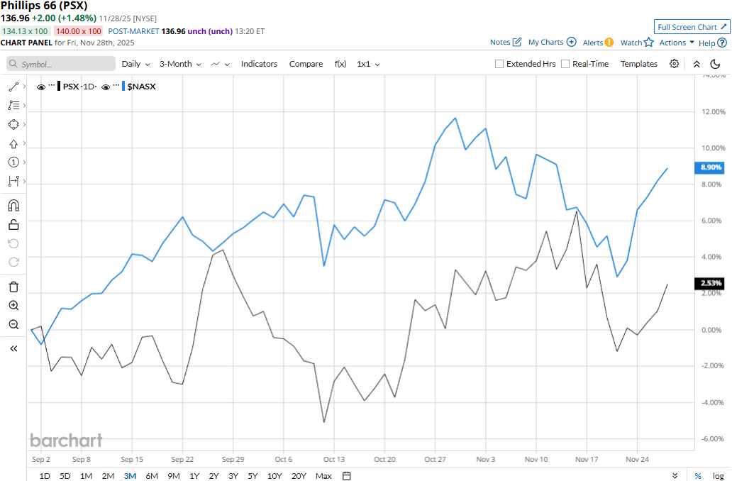 Phillips 66 touched its 52-week high of $143.25 on Nov. 14 and is currently trading 4.4% below that peak. Meanwhile, PSX stock prices have gained 3.1% over the past three months, lagging behind the Nasdaq Composite’s ($NASX) 7.7% surge during the same time frame.