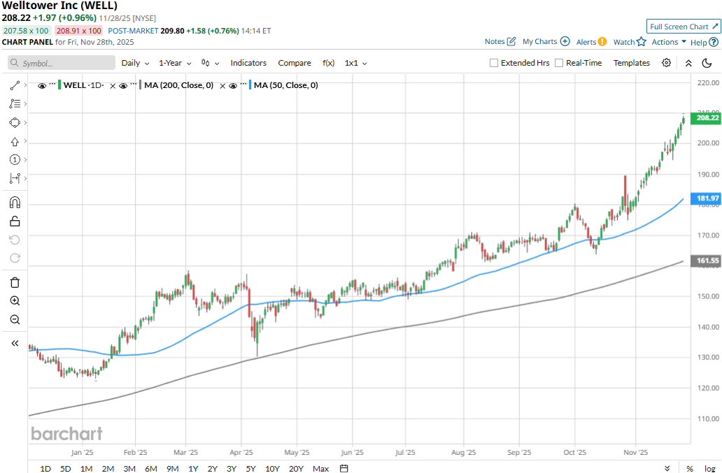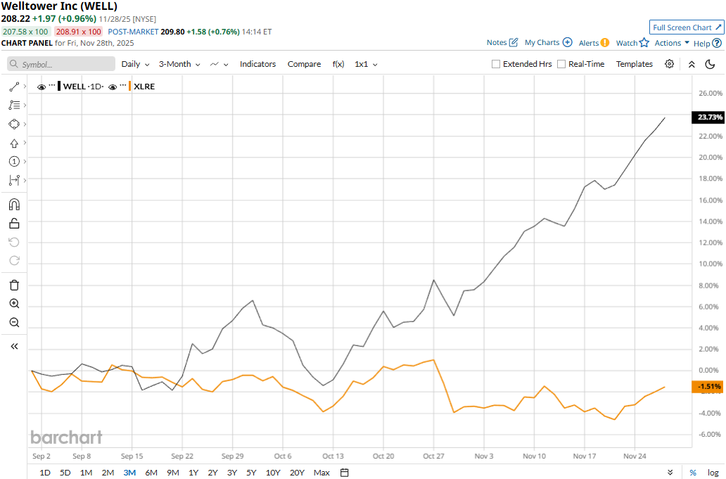 WELL stock touched its all-time high of $209.05 on Nov. 28 and is currently trading marginally below that peak. Meanwhile, WELL stock prices have soared 24.4% over the past three months, outperforming the Real Estate Select Sector SPDR Fund’s (XLRE97 bps dip during the same time frame.