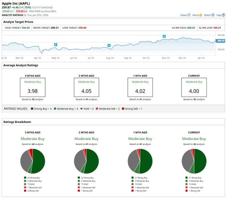 Among the 42 analysts covering the stock, the consensus rating is a “Moderate Buy.” That’s based on 21 “Strong Buy” ratings, three “Moderate Buys,” 16 “Holds,” one “Moderate Sell,” and one “Strong Sell.”