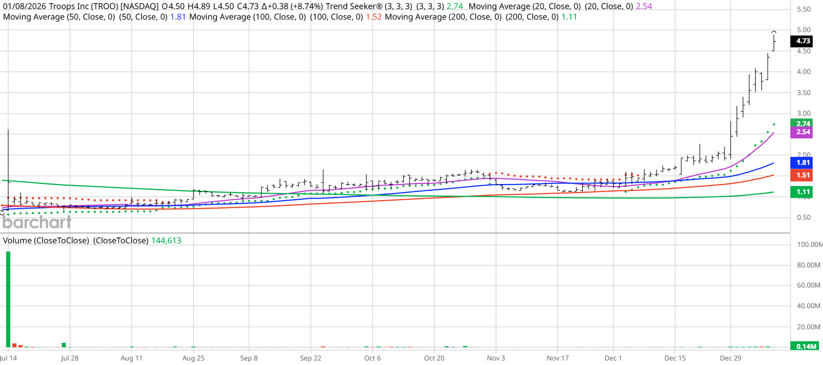 - Troops (TROO) has surged 179% since a Trend Seeker “Buy” signal was issued on Dec. 8.