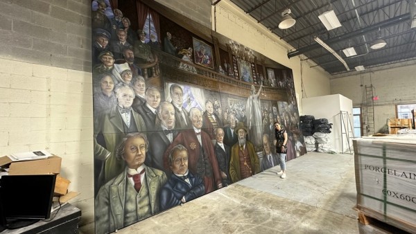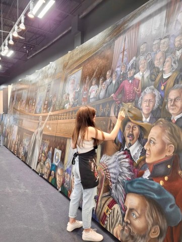 Hijazi’s latest project, completed and signed 2023, "TIMELESS TALES: Artistic Narratives of Canada's Rich Heritage," is an ambitious and monumental oil painting on canvas, measuring 900 by 450 cm. This mural encapsulates the vast and diverse history of Canada, from its founding to the present day. It features an impressive array of important Canadian historical figures, including Indigenous, French, and English heroes, leaders, artists, athletes, and scientists. These figures, who have played pivotal roles in shaping Canada, are depicted together in one grand hall, symbolizing the unity of their goals and their collective contribution to the nation’s development.