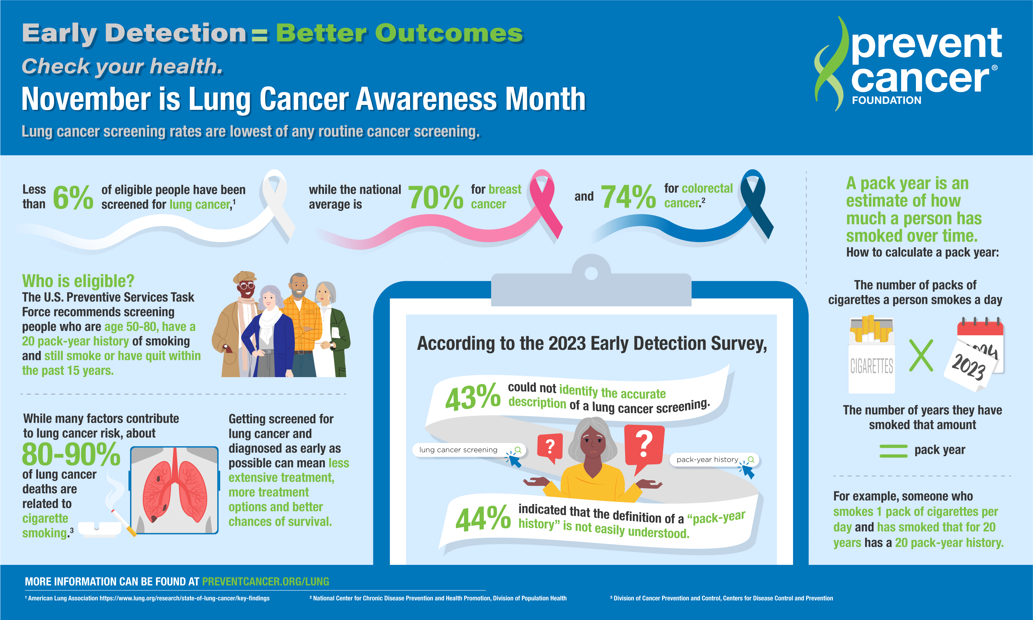 “Although anyone with lungs can get lung cancer, routine screening is only recommended for those with increased risk due to their smoking history. It’s important to know whether you meet the criteria to get screened,” said Heather Mackey, DNP, ANP-BC, AOCN®, Senior Director of Cancer Prevention and Early Detection at the Prevent Cancer Foundation.