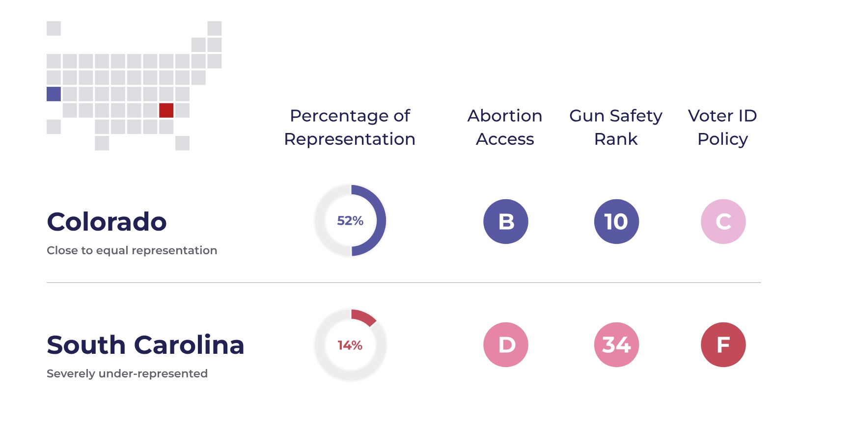 - More Women, Better Abortion Access: In states where abortion access is more protected, women hold an average of 41% of legislative seats, compared to only 27% in the most restrictive states.